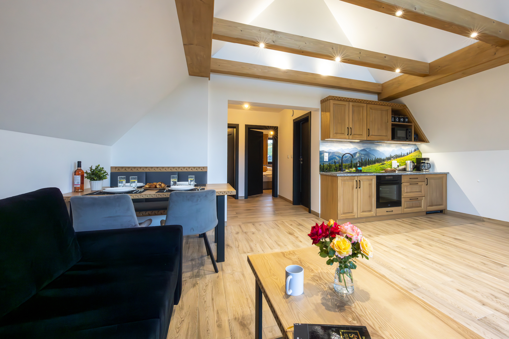 Apartamenty Bliżej Nieba w Rzepiskach to kameralne miejsce stworzone z myślą o osobach ceniących ciszę, komfort i bliskość natury. Do dyspozycji Gości przygotowano trzy nowoczesne apartamenty, każdy urządzony z dbałością o szczegóły i w pełni wyposażony, aby zapewnić wygodny pobyt o każdej porze roku. Duże okna i przestronne tarasy otwierają widok na panoramę Tatr, dzięki czemu każdy poranek i wieczór można spędzać w wyjątkowej scenerii górskich krajobrazów. To idealne miejsce zarówno na rodzinny wypoczynek, jak i romantyczny wyjazd we dwoje, gdzie atmosfera spokoju i pięknych widoków sprzyja prawdziwemu relaksowi.